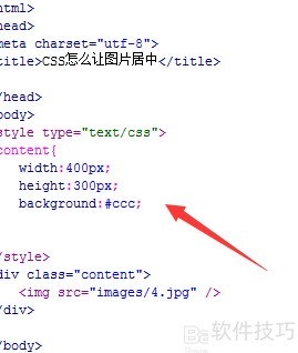 5、 在CSS中,为class名为content的div设置样式,将其宽度设为400像素,高度设为300像素,并将背景色设定为灰色,通过width、height和background属性分别定义尺寸与背景颜色,实现指定的视觉效果。