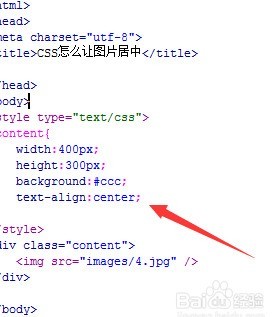 6、 通过在CSS中对div设置text-align属性为center,可使内部图片内容水平居中显示,从而实现图片在容器中的居中效果。