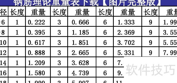 5、 钢筋每米重量(千克)可通过其直径(毫米)的平方乘以系数0.00617计算,即重量 = 直径? × 0.00617。其中,0.00617是根据圆10钢筋每米重0.617千克推导出的常数。钢筋单位重量与直径的平方成正比,公式也可表示为G/m = 0.617 × D? ÷ 100。