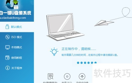 1、 打开小白一键U盘装系统软件,主界面左侧显示主要功能选项,包含默认模式、ISO模式和本地模式,通常选择默认模式即可。图中所示为未插入U盘时的提示状态。