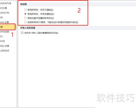 4、 打开信任中心对话框,进入宏设置选项,在右侧区域按需选择合适的宏配置,完成后点击确定按钮即可。