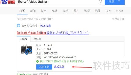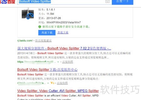 1、 首先通过浏览器访问百度,搜索Boilsoft Video Splitter,找到相关链接后下载安装包并完成软件安装即可。