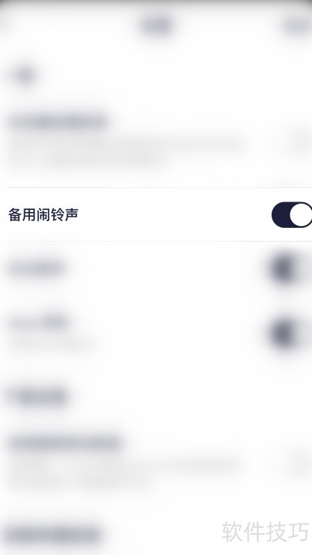 4、 进入设置,点击备用闹铃声右侧的圆点