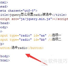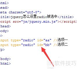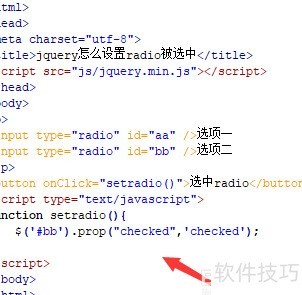6、 在js标签中定义setradio()函数,通过idbb获取第二个input元素,利用prop()方法将其checked属性设为true,使其处于选中状态,从而实现自动选择第二个选项的功能。该操作可在页面加载或触发特定事件时执行,确保目标单选框被正确选中。