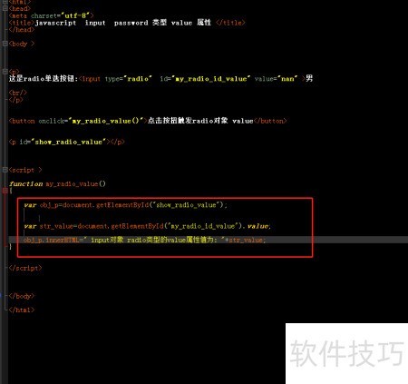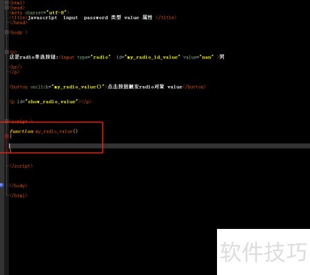 5、 在JavaScript中定义一个名为my_radio_value的自定义函数,用于获取单选按钮的值。