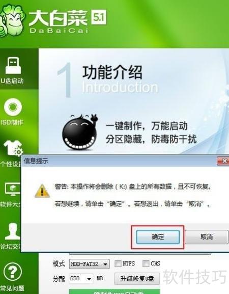 6、 点击一键制作USB启动盘后,会弹出提示窗口,确认将清除U盘内所有数据。若U盘中有重要文件,请提前备份。确认无误后,点击确定继续操作。