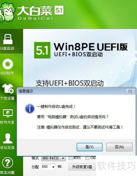 8、 制作完成后,系统会弹出提示窗口,选择是可进行测试,选择否则退出程序,至此USB启动盘制作流程顺利完成。