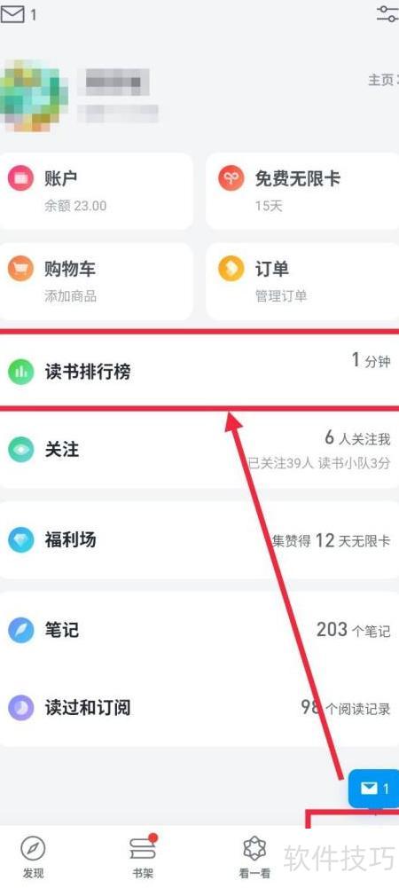 3、 进入我页面,点击读书排行榜