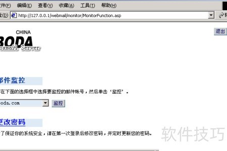 4、 Web邮件监控的默认首页路径为http://webmail地址/monitor/index.asp,例如:http://127.0.0.1/webmail/monitor/index.asp。该页面用于访问监控功能,具体界面所示。