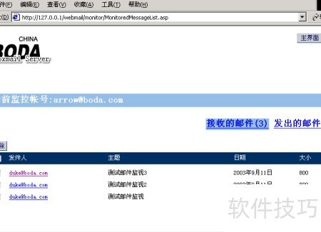 10、 列表按域名排列用户,域名以淡蓝色显示,其下属邮件用户缩进列出。选中某个邮件用户后点击监控,页面将跳转至如下界面。