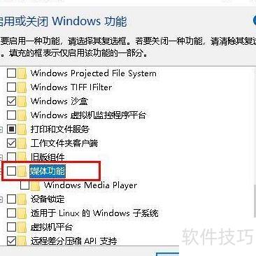 5、 显示带有Windows功能的窗口,向下滚动找到媒体功能选项,取消勾选该项,点击确定以启动操作。