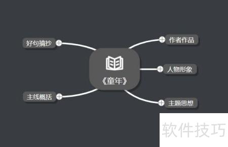 6、 双击思维导图中心节点,输入童年,并在其下创建作者、主题思想、人物介绍等二级分支,每个二级节点后可继续添加相应的三级内容。