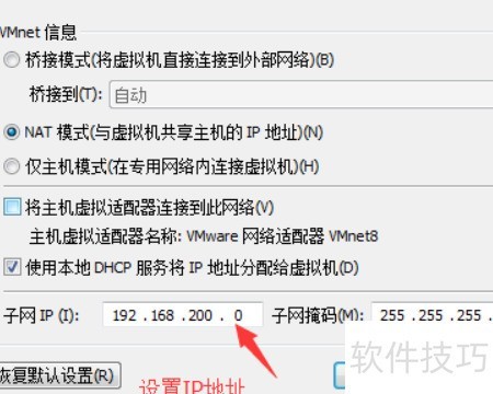 8、 在此处配置IP地址,可自行设定,我将其设为192.168.200.0,子网掩码保持默认值即可。
