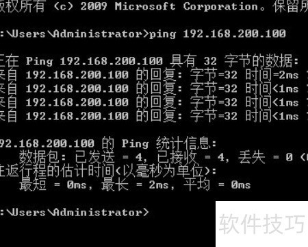 13、 输入命令 ping 192.168.200.100 进行测试,结果显示网络连接已成功建立。