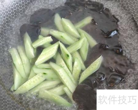 4、 锅中烧水,水热后放入木耳黄瓜焯熟捞出。
