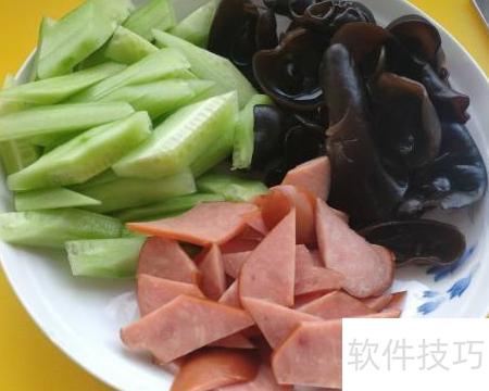 1、 木耳切小朵,黄瓜去皮切块,脆皮肠切成段备用。