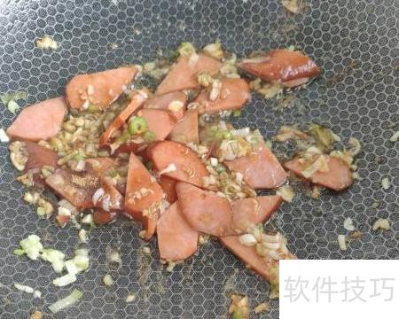 6、 锅中留油,爆香葱蒜,加入脆皮肠翻炒,依个人口味调入适量调料即可。