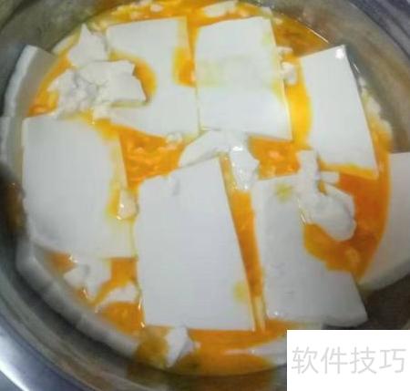 2、 将切好的豆腐整齐摆入盘中,可拼成图案,倒入打散的蛋液,撒上适量盐即可。