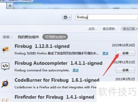 3、 搜索完成后,在结果中找到Firebug插件,点击安装即可直接进行安装操作。