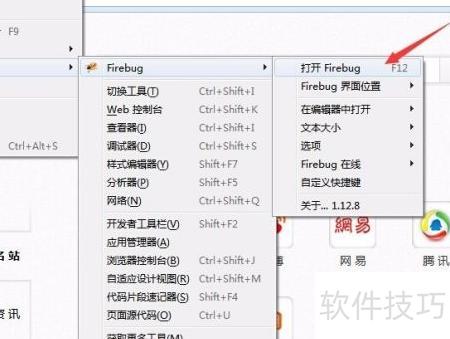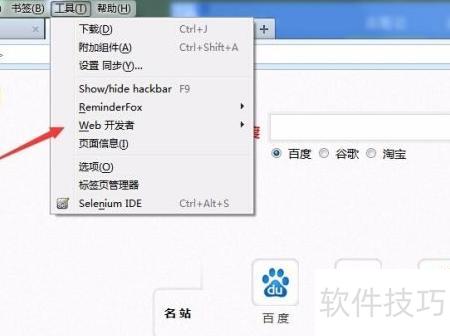 4、 安装完成后,可打开Firebug插件,通过点击工具菜单中的Web开发者选项进行操作。