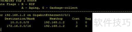 18、 可通过执行 display rip 1 route 命令进行最终验证,确认路由信息是否正确生成与更新。