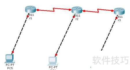 3、 将路由器r2按相同方式设置:连接r1的端口地址为192.168.4.2,连r3的端口地址为192.168.5.1,时钟速率设为64000,连接PC的端口IP为192.168.2.3,具体连接所示。