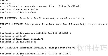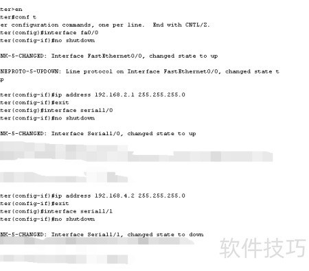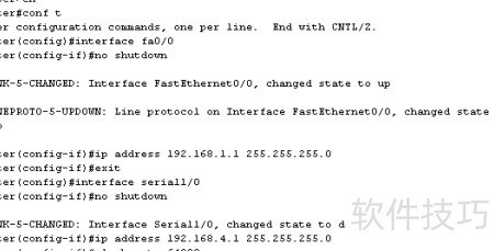 2、 进入特权模式后,选择与PC相连的fa0/0端口,执行no shutdown命令启用该端口,并为其设置IP地址192.168.1.1。配置完成后退出,接着进入serial1/0端口,分配IP地址192.168.4.1,并设置时钟频率为64000,确保链路同步正常,完成各接口的基本参数设定,保障网络连通性与数据传输稳定性。