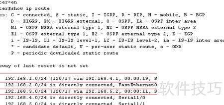 6、 进入全局配置模式,执行show ip route命令查看路由表,图中红色框选部分即为路由器通过动态学习获取的路由条目。
