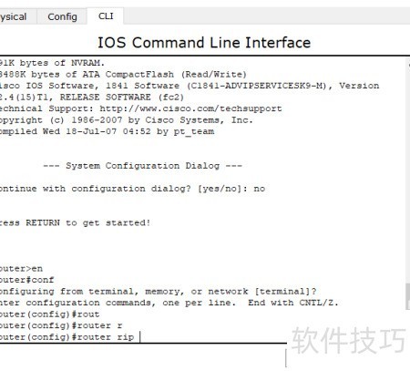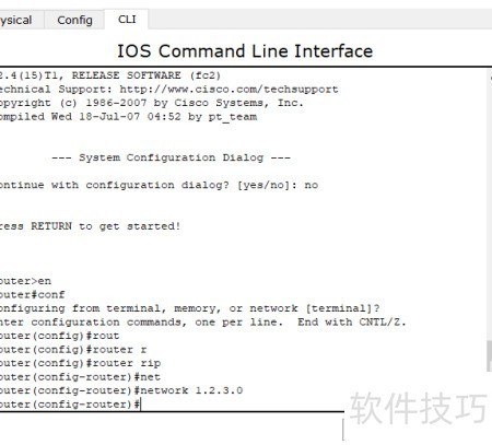 2、 进入全局配置模式后,执行route rip命令以开启RIP协议配置。