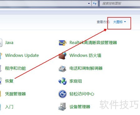 3、 把控制面板文件夹的显示模式调成大图标样式。