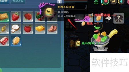 将小麦饲料与蓝莲饲料放入工具台制作,再同钓获的鲍鱼一同置入烹饪锅,点击烹饪即可制成黑马饲料。