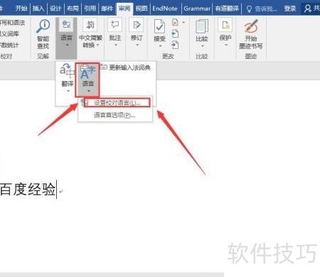2、 点击下拉菜单中的语言选项,选择校对语言,操作所示。