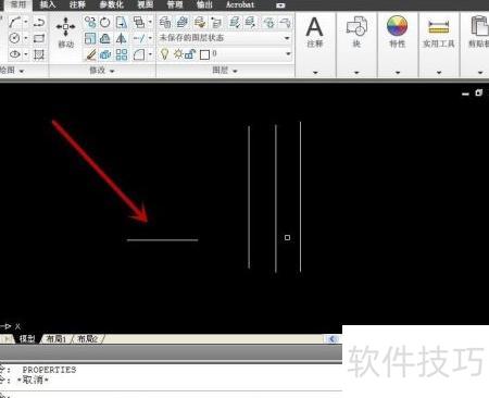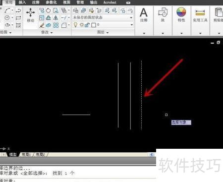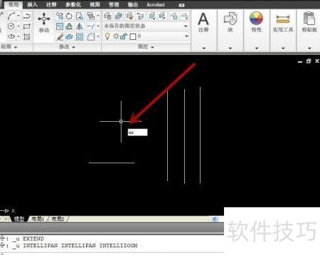 8、 输入EX命令,按空格键后点击第三条竖线,即可将横线延伸至该竖线位置。