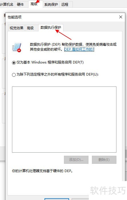 3、 在性能设置里找到数据执行保护,确认该功能已处于开启状态。