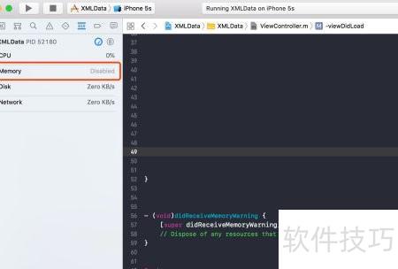 1、 编译运行Xcode工程后,左侧Debug区域的Memory显示为Disabled,当前内存使用情况未呈现,无法查看具体数值。