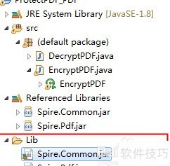 1、 在Java项目中创建一个名为Lib的文件夹。下载并解压安装包后,进入解压目录中的lib子文件夹,找到Spire.Pdf.jar和Spire.Common.jar两个文件,将其复制到刚刚创建的Lib文件夹中,操作所示。