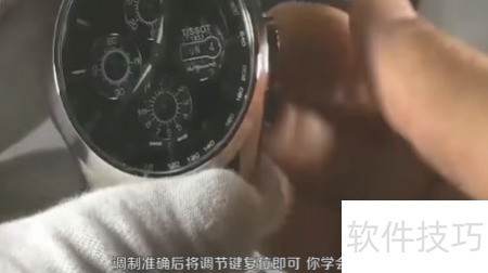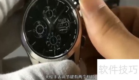 调节天梭速驰三眼表时,先将调校钮拨至日期档,旋转调校钮调整日期,完成后推回原位即可。