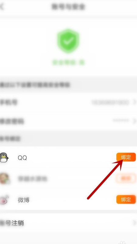 3、 进入账号与安全页面,点击QQ项后的绑定按钮完成操作。