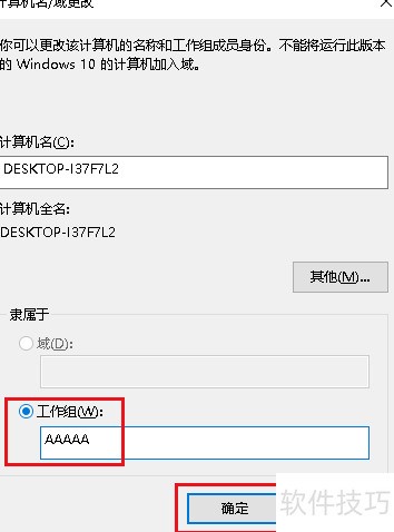 4、 弹出对话框后,将工作组名称更改为新名字或任意字母,然后点击确定按钮完成操作。