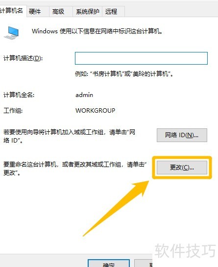 3、 在系统属性窗口中,找到并点击更改按钮,该按钮位于要重命名计算机或更改域或工作组,请单击更改文字的右侧。