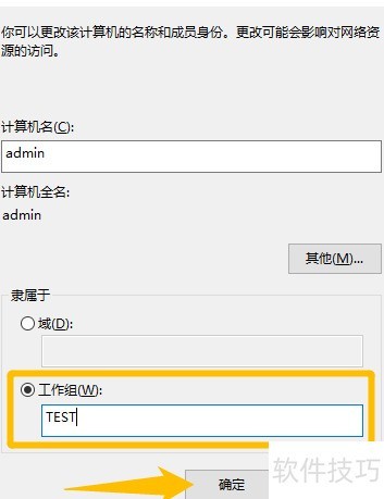 4、 在计算机名/域更改窗口中,将工作组名称更改为自定义名称,然后点击确定完成设置。