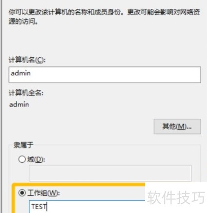 9、 点击更改按钮后,弹出如下界面。在下方隶属于区域中选择工作组,输入新名称,确认无误后点击确定即可完成设置。