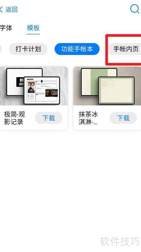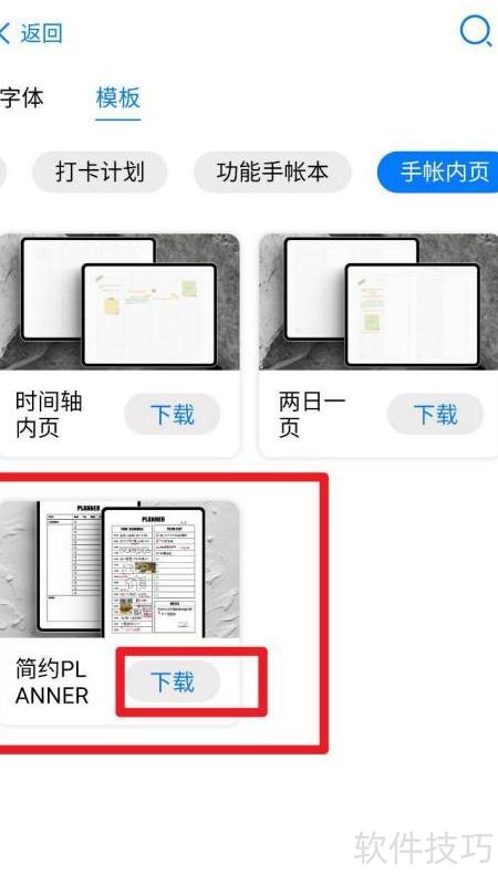 3、 进入模板栏目,选择手帐内页,找到简约PLANNER并点击旁边的下载按钮即可获取。