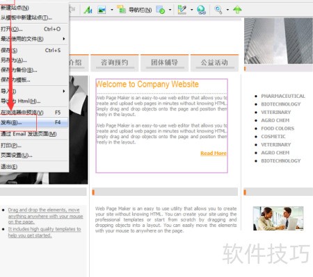 13、 完成创作后,点击文件菜单中的发布选项,即可将网页发布供客户浏览。