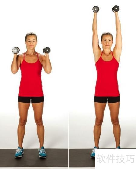 7、 双臂伸直上举哑铃至头顶,还原起始动作,循环往复进行练习。