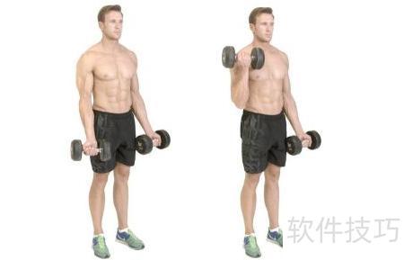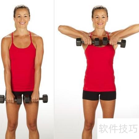 14、 双手持哑铃垂于体侧,垂直上举至胸前,双臂外展并与身体保持同一平面。