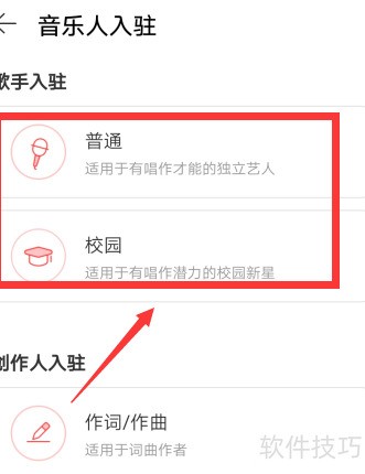 6、 进入音乐人页面,选择普通或校园歌手类型入驻。