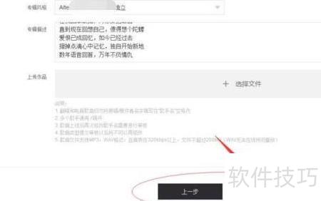 7、 进入上传作品页面,点击上传歌曲,填写音乐风格及作词、演唱、混音等信息。