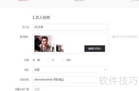 4、 注册音乐人账号后,需完善个人信息。填写音乐人名称,若系统已收录该音乐人,可直接点击已有选项完成绑定。