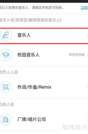 7、 点击入驻音乐人/发行歌曲,进入申请页面后选择音乐人选项。